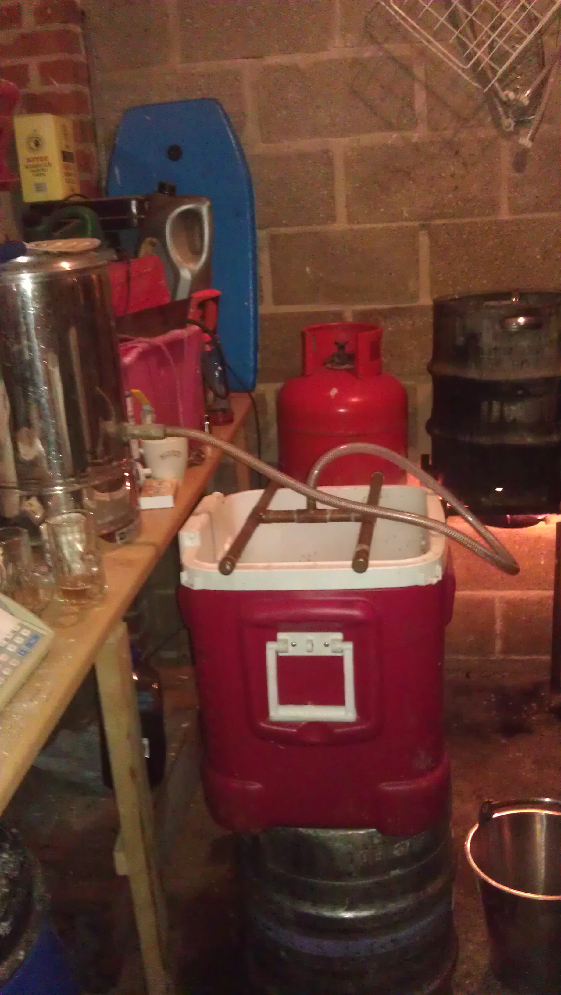 Initial taste was very watery due to our poor efficiency. So to fix this 500g spray malt, 1.5kg liquid malt extract (medium) and 500g glucose were disolved and boiled in 1 l of water to sanitise. This was then split equally between the 2 fermenters. This raised the ABV from a poor 2.6ish% to 5%. This has given a decent body to the beer, and it is very close to being a Leffe clone. The malt extract (medium) has darkened the beer. Matt was particularly concerned that at such a low ABV and with plenty of nutritious protein this beer could have been at a heigh risk of infection.