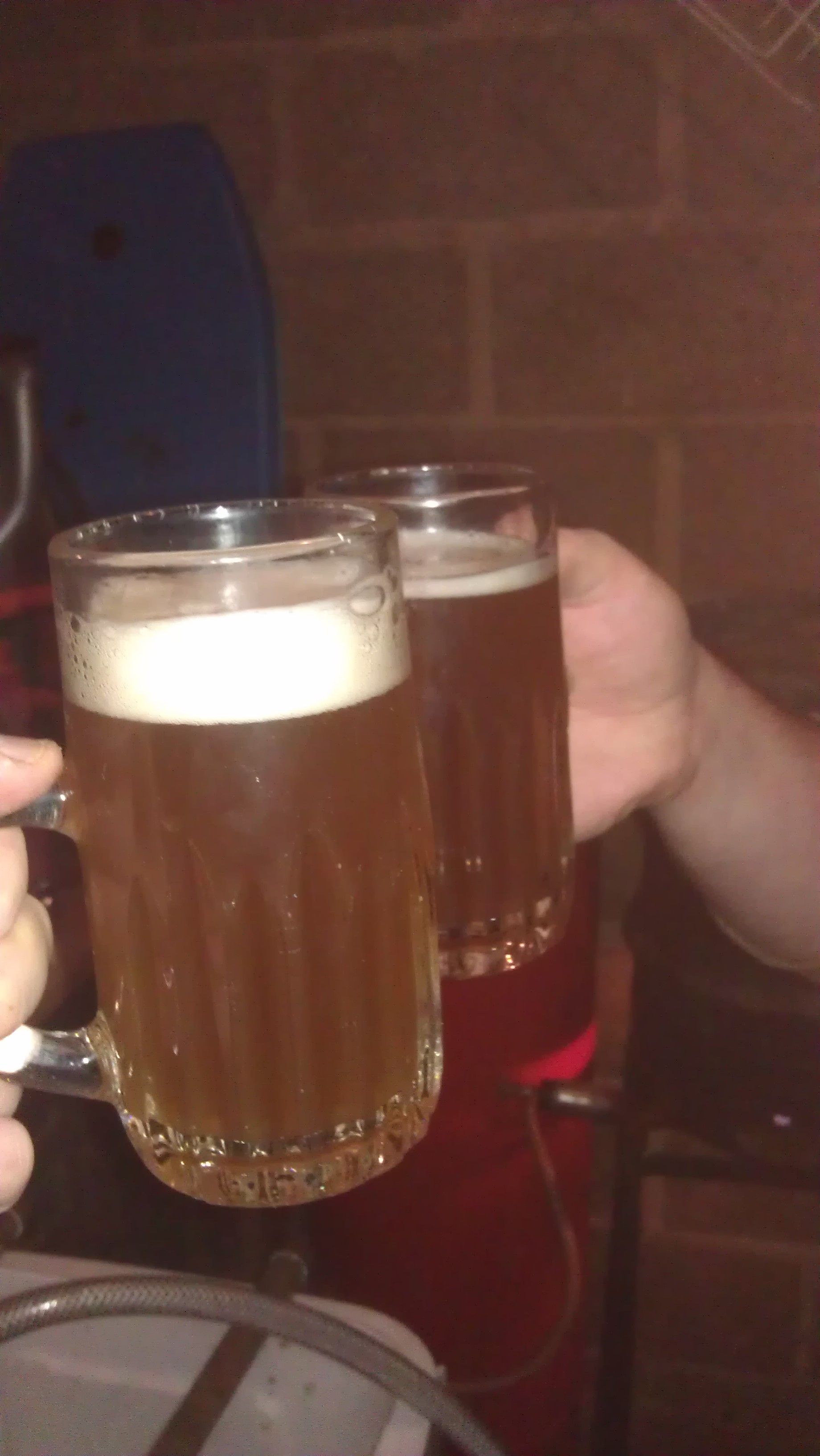 Here is a photo of the final product, being drunk on another brew day. It tastes especially good with a heigh carbonation, essential. Wheat beers are also best drank young.