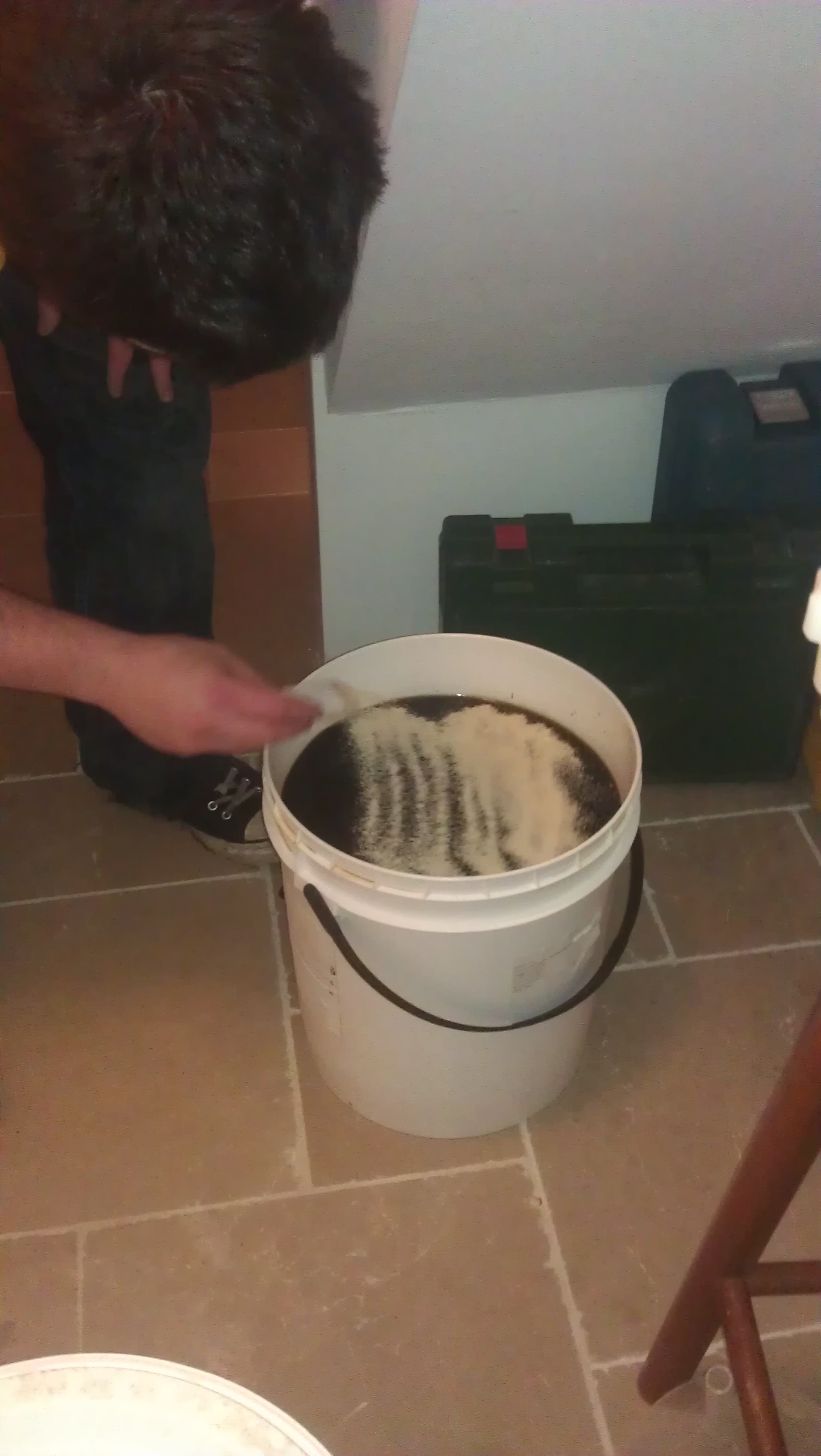 Here is a photo of James adding yeast to a brew.  Since Matt took the photo you have the top of his head and a shoe.