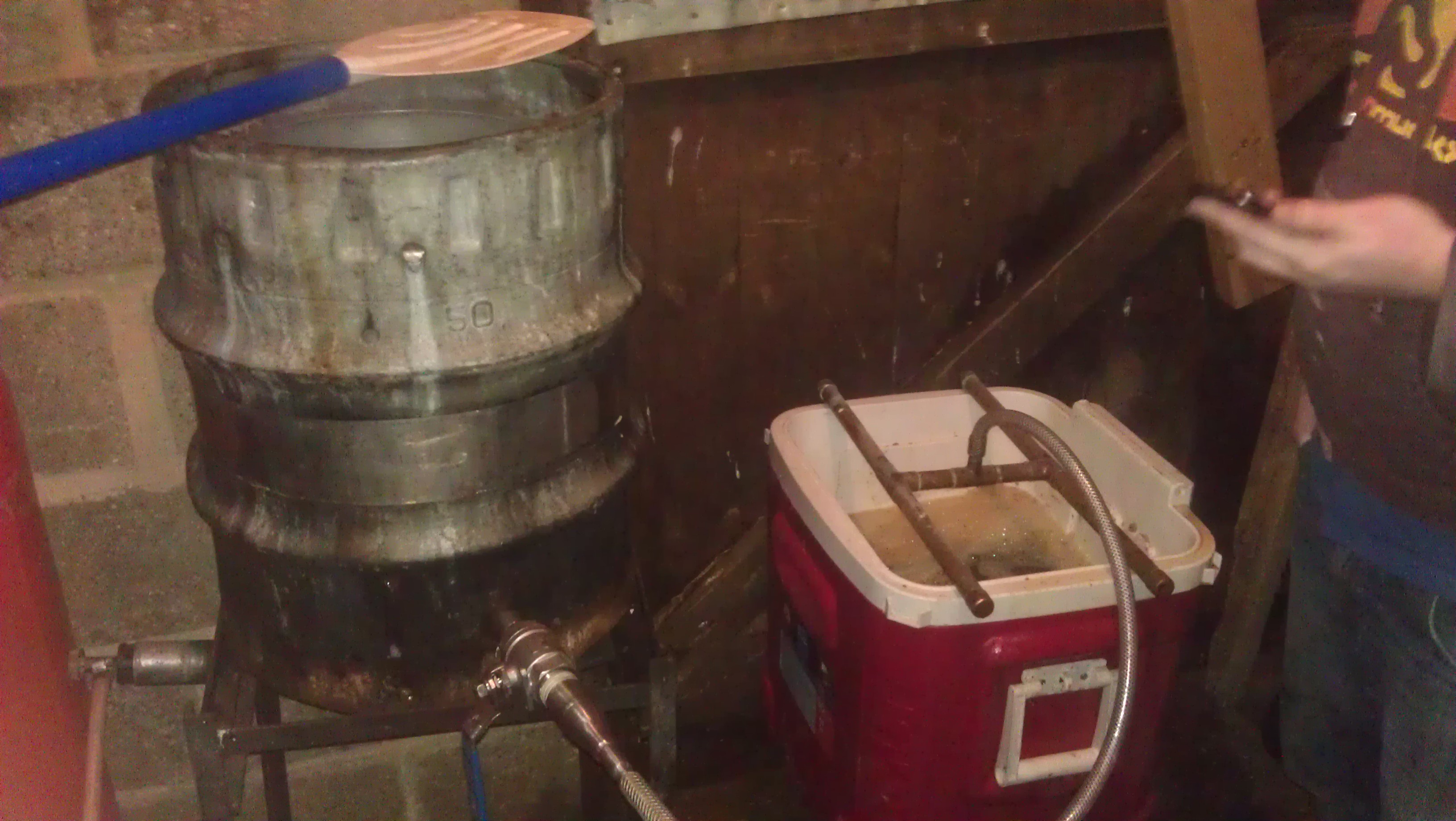 We recirculated a few Litres using the pump, (lots of floating straw / debris) and collected the wort straight into the 50L boiler. We figured that at 20% boil reduction we will need 48L and this is pretty much all we can fit into our 50L boiler anyway- so no point in measuring…. just fill the boiler up. We had a very liquid mash so hardly any sparge water was needed. The mash appeared to visibly swell and absorb water, a real protein gooey grey mass.