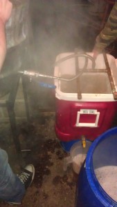 Flash cooled to ~ 30C but as the hop strainer got blocked at the end, the last 5L or so we had to scoop out and run through a sieve. This mean’t we couldn’t cool using the setup we had. We ended up having to add last 5L of the hot wort back into the fermenters – therefore it was decided to leave overnight to cool in the fermenters.
